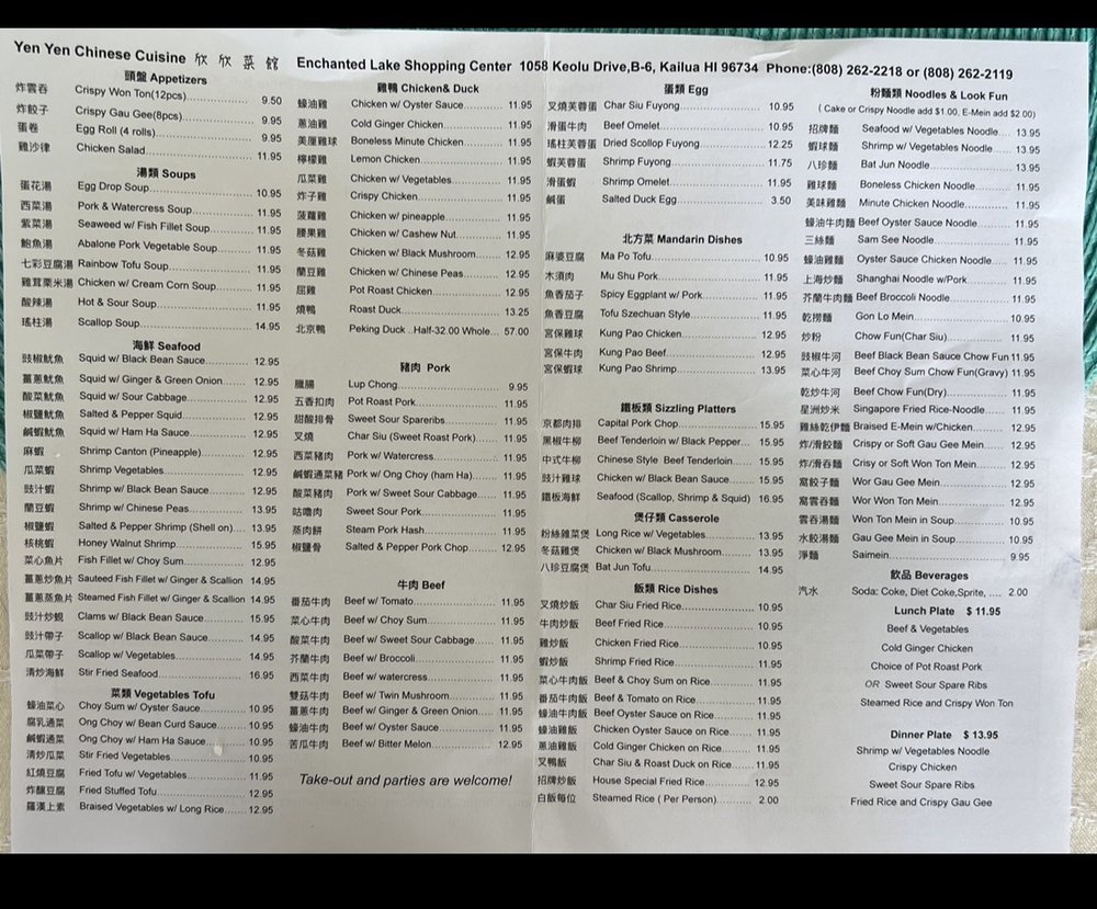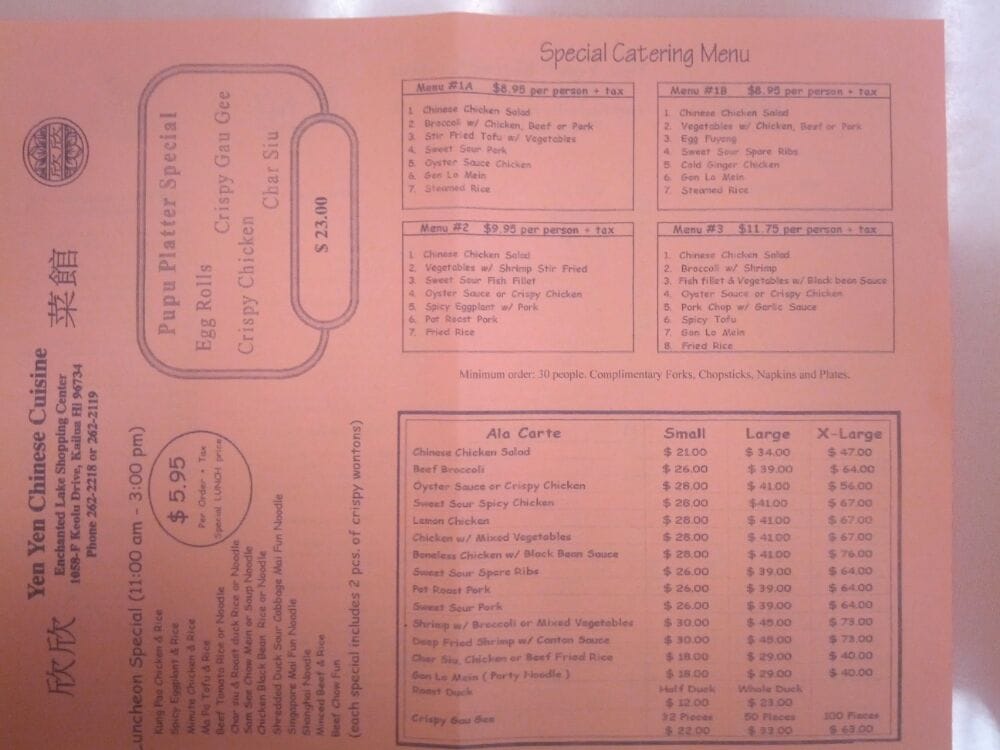 Welcome to Yen Yen Chinese Cuisine, where authentic flavors and a casual atmosphere blend seamlessly. Located at 1058 Keolu Dr Ste B6 in Kailua, HI, this gem offers a diverse menu that caters to all palates, featuring house specialties like General Tso's Chicken and Honey Walnut Shrimp.