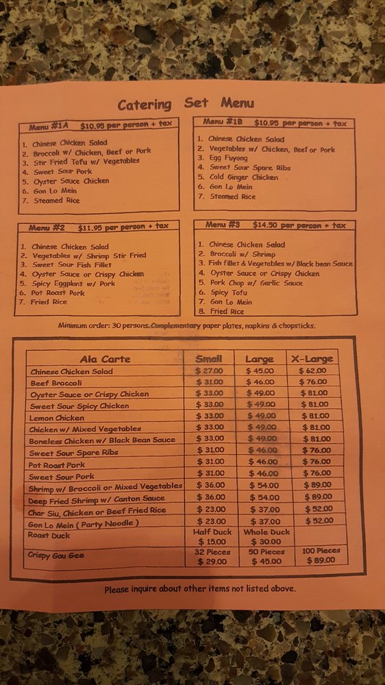 Beef & vegetables cold ginger chicken sweet sour spare ribs steam rice crispy won ton.